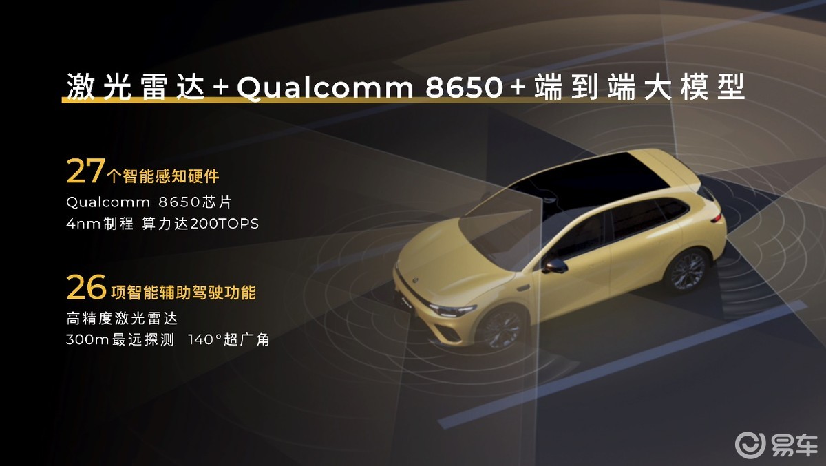 辅助驾驶方面,零跑Lafa5搭载含激光雷达在内的27个高精度感知硬件与高通8650芯片,支持端到端辅助驾驶,可实现高速领航辅助(NAP)、通勤领航辅助(CNAP),可以不依赖高精地图,实现领航辅助驾驶,未来将通过OTA实现城区领航辅助。