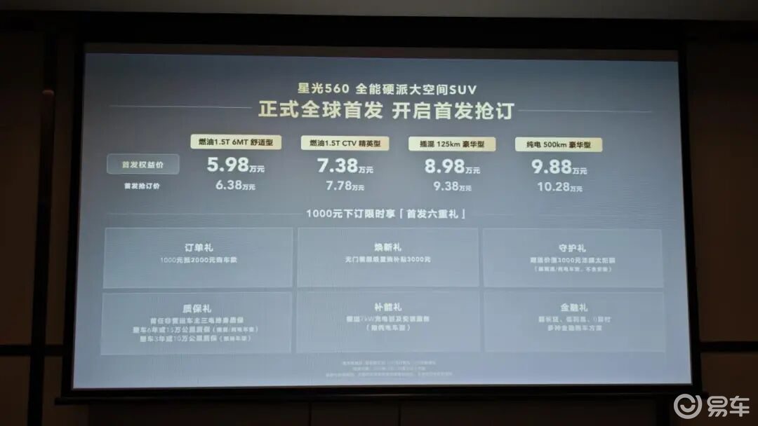 动力系统方面,星光560燃油版车型采用1.5T发动机,最大功率130kW,峰值扭矩290N·m,变速箱提供6MT,CVT两种形式;插电式混动版本采用1.5L插混系统,提供125km纯电续航,综合续航1100km,亏电油耗5.3L/100km;纯电动版本采用100kW电动机,提供60kWh电池组,纯电续航500km。