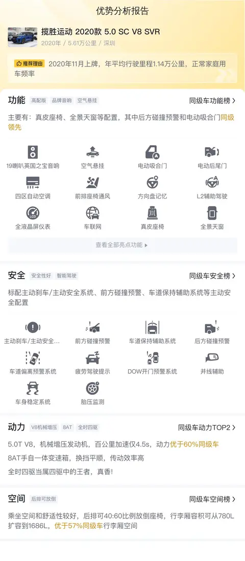 综上所述的新车含税价、用车成本、市场行情、优势分析、同款比价等数据仅供参考。在配置部分,因为二手车非标品,车辆可能会存在配置改装的情况,具体车况信息需要线下结合车辆实际情况进行综合参考。