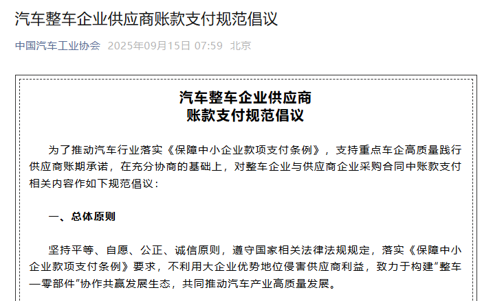 9月15日,中国汽车工业协会发布《汽车整车企业供应商账款支付规范倡议》,就订单确认、交付与验收、支付与结算、合同期限等关键环节,对整车企业与供应商企业采购合同中相关内容作出规范倡议,引发多家车企表态响应。