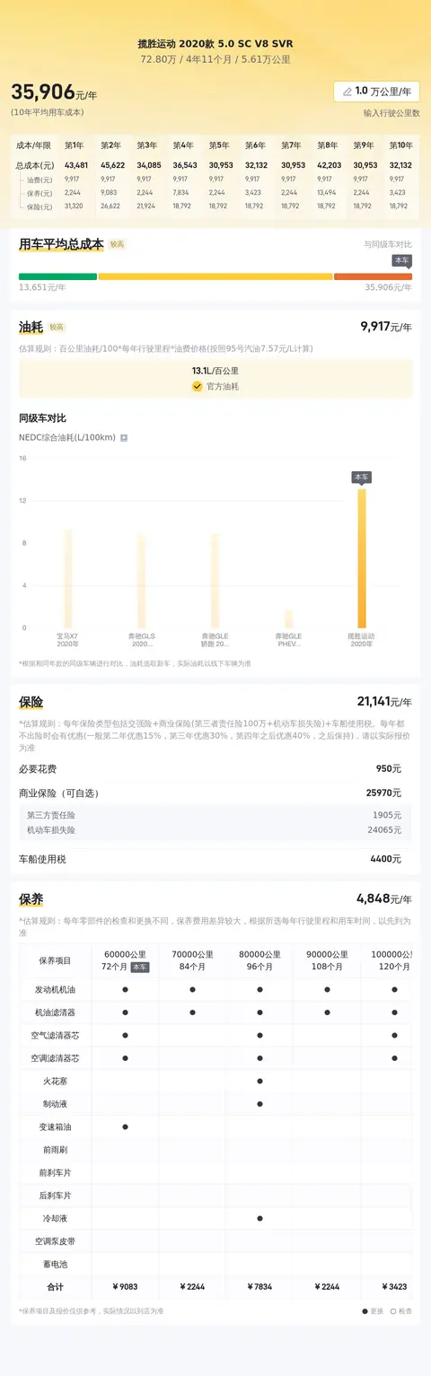 在考虑拥有路虎揽胜运动版SVR的喜悦之余,我们也不得不面对一些不可避免的用车成本。首先,SVR那强劲的引擎和豪华配置意味着它有着较高的燃油消耗和保养费用。其次,保险费用也是不容忽视的一部分,尤其是对于这样一款高性能车型,保费自然不会太低。此外,零部件的更换和维修也可能因为其特殊性和进口因素而增加额外成本。最后,别忘了还有年检、车船税以及可能的停车费或洗车费等日常开支。虽然这些成本可能会比普通车型更高,但相信对于热爱并珍惜SVR的人来说,这些都是为了能够持续驾驶这位“猛兽”的必要投资。