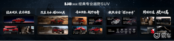 北京越野董事长王昊表示,BJ40作为中国越野的领路者,亲历过无数盛事荣耀,也成为中国汽车的独特文化符号,在全球用户的认可中走入了万千家庭。BJ40以探险家的名义,开启全新征程,在经典设计、自由改装、专业性能、极致安全和跨圈舒适五大维度再造新经典,为中国越野车市场再造经典专业越野SUV。