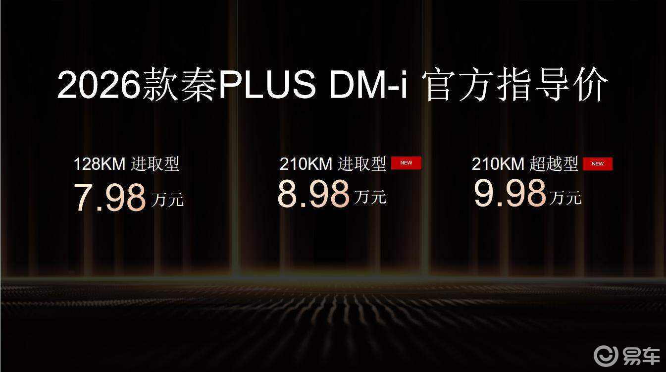 价格方面,2026 款秦 PLUS DM-i 以 7.98 万元的亲民定价击穿行业底线,秦 L DM-i 四款车型限时优享价9.28 万元- 12.28 万元,宋 Pro DM-i 则以 9.98 万元 - 12.78 万元的区间覆盖主流家庭需求,每一款都堪称越级超值。