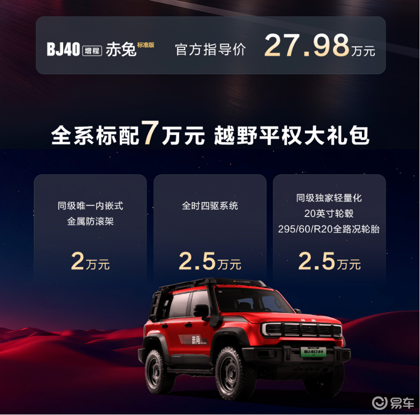 此外,BJ40赤兔标准版还把权益做成“交付包”:金融、置换、救援、保养、质保、充电桩、流量、终身OTA等。可以说,把后市场的不确定成本,前置成可计价权益。就看消费者是否能感知到这是真正的赚到。