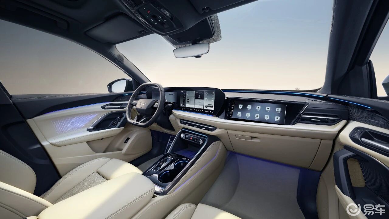 内饰方面:和A5L一样,全新Q5L也加入了“三屏”阵营,包括一个为驾驶员提供的11.9英寸仪表显示屏,一个14.5英寸的中控触摸屏,和可为副驾驶前方选装的10.9英寸娱乐屏幕,此外贯穿前门两侧和中控台前方的LED灯带不仅起到氛围灯的装饰效果,更可作为人机交互灯语,在导航提示转向,紧急避让等情况下通过不同的动态光及颜色提示驾驶者。中央扶手下方配有手机无线充电,两个前部 USB-C端口支持60 瓦功率高速充电,而后部的USB-C端口支持100瓦充电功率,可支持笔记本电脑等更大功率的用电设备,此外全新Q5L的后排座椅支持整体前后调节,从而调节后排腿部空间和后行李箱容积。