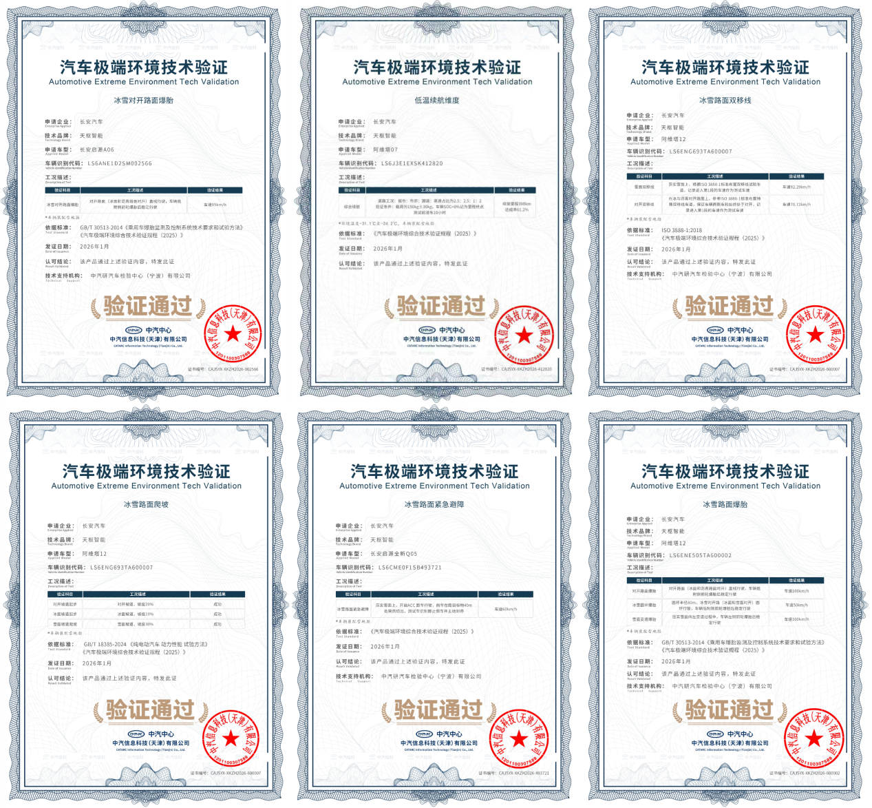 具体来看,在同级独有的分布式电驱系统和智能动态扭矩控制技术加持下,阿维塔 12在雪面及冰雪对开路面双移线测试中,分别以 92.3km/h 和70.7km/h的速度变道不偏移、稳健通过验证,居行业测试记录第一,大幅提升用户在极端路况下的安全避障能力;天枢智能爆胎稳行系统,让长安启源 A06 在冰雪对开路面上实现 95km/h 高速爆胎稳定行驶,同级第一,相关功能将于年内OTA推送;首创零耗电触媒续航增强技术,如同给车辆配了一个可插拔的“自热暖宝宝”,使阿维塔07低温续航里程达成率提升至61.2%,行业第一;阿维塔12冰雪路面爬坡,凭借脉冲脱困和四轮驱动力矢量控制技术,让车辆在冬季冰雪坡道场景如履平地,毫秒间脱离困境;同时还有阿维塔12全场景爆胎无感以及长安启源全新Q05冰雪路面紧急避障等一系列测试,均通过了中汽中心汽车极端环境技术验证。