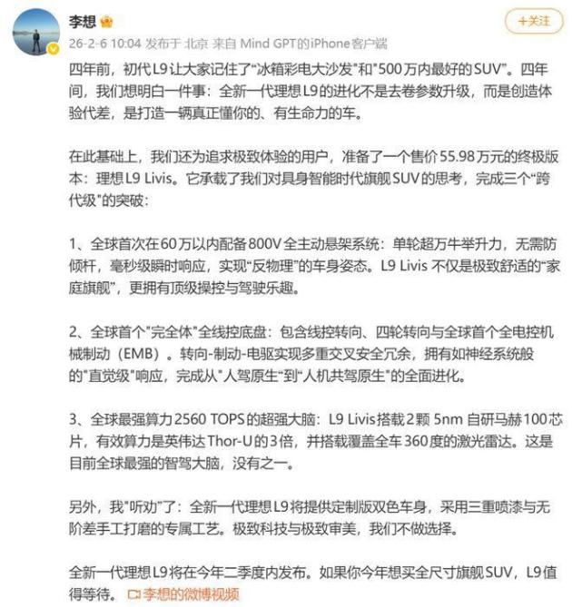 2月6日,理想汽车CEO李想在社交媒体上发布了关于全新理想L9的信息,并公布了售价为55.98万元的顶配版本——理想L9 Livis。