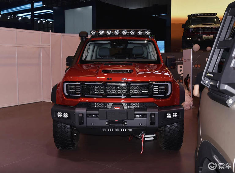 外观方面,两款新车倒是没有什么调整,继续延续家族经典“方盒子”造型,同时搭载专属设计彰显个性。悦野飞行版最引人注目的是车顶悬浮式气动美学机舱,作为无人机收纳舱,兼具收纳、充电与一键释放功能,造型科幻且实用性拉满。赤兔车型则会使用赤兔拉花装饰,搭配火焰红定制车漆,辨识度极高,同时配备扩充版轮眉、铝合金脚踏与高进气涉水喉,原厂改装件直接满足越野玩家需求,外挂式全尺寸备胎与竖向尾灯组则延续家族经典设计。