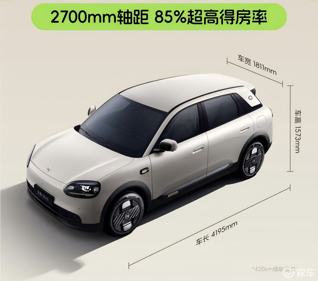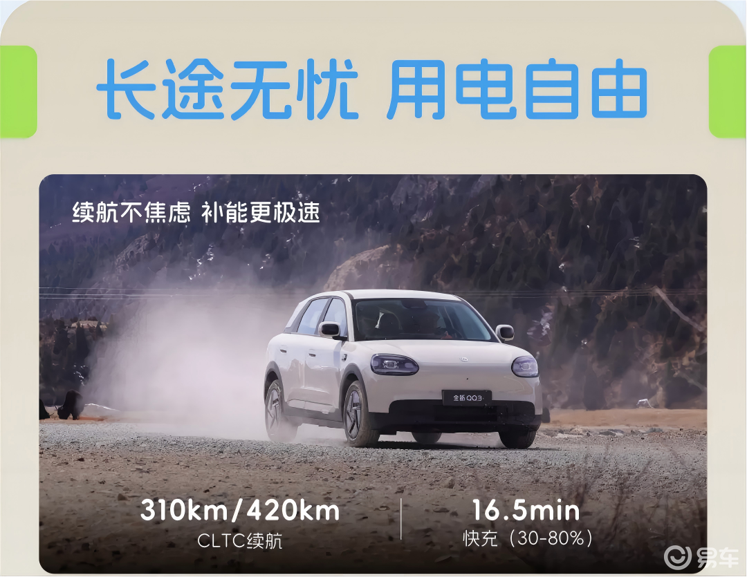 动力上,奇瑞QQ3 EV搭载后置后驱纯电动力系统,电机最大功率58kW/90kW,最大扭矩90N·m/115N·m。电池方面,车辆搭载29.48kWh、41.28kWh两款电池,CLTC纯电续航里程分别为310km和420km,快充30%-80%≤16.5min,同时还支持3.3kW/6.6kW外放电功能。此外,车辆还将配备后多连杆独立悬架,最小转弯半径5.2m。