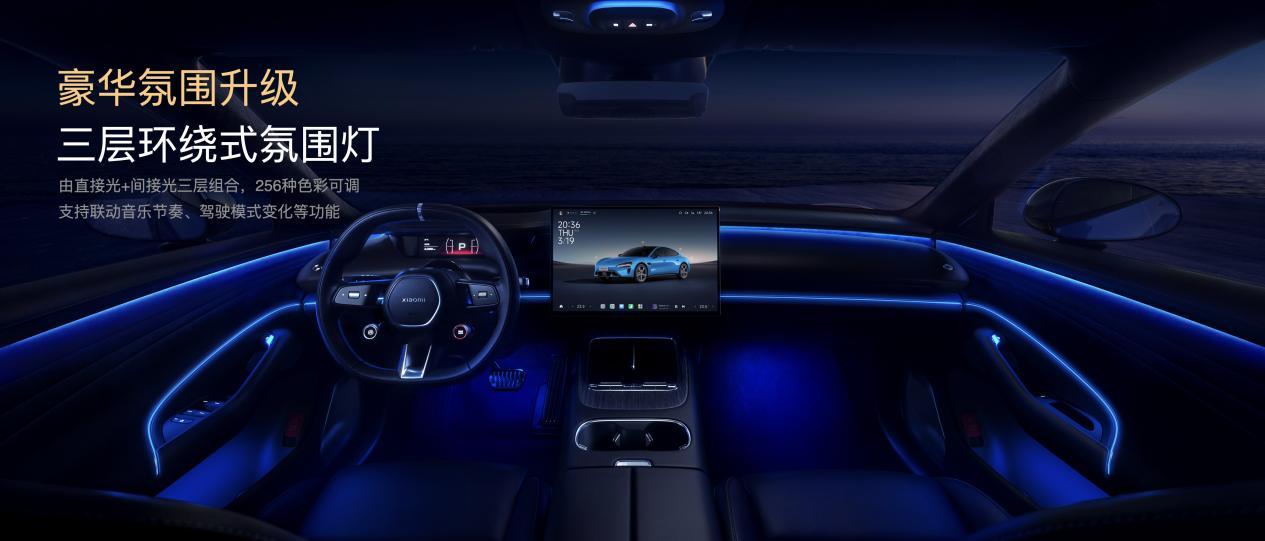 内饰的升级则更贴合家用豪华的定位,新一代 SU7 通过色彩搭配、材质选择、功能优化,重构了座舱的体验感。四款内饰配色中新增的暗夜黑、砂陶米,进一步丰富了用户选择,对称式的中控台布局优化了主副驾的操作便利性,高频接触面 100% 软质材料包裹,再加上 Nappa 真皮方向盘、豪车级绗缝工艺的运用,让内饰的精致感落到实处。而长度达 3636mm 的环抱式氛围灯,不仅营造了座舱的氛围感,还具备开门预警等实用功能,实现了情绪价值与使用价值的结合。