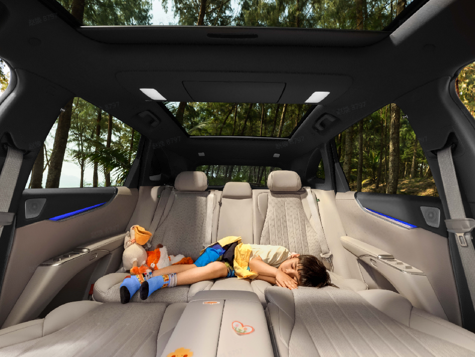 新车全系标配伊姆斯零重力躺椅与一键成床功能,前排座椅搭载加热、通风、按摩全功能,后排座椅支持 115°-125° 椅背电动调节与加热、通风功能,配合方向盘加热、电动尾门、50W手机无线充电、20扬声器智能环绕音响、多色智能交互氛围灯等配置,于细节处拉满全家出行的豪华舒适体验。