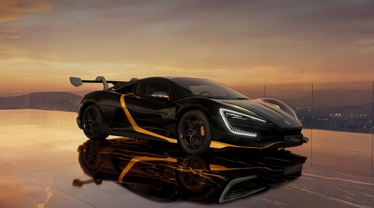 它的设计灵感源自仰望U9X打破496.22km/h全球极速纪录时的清晨阳光。 为此,车身漆面调入了微米级超细金粉,不同光线下能复刻朝霞般的流光;哑光金区域更采用了中国非遗大漆打磨工艺。